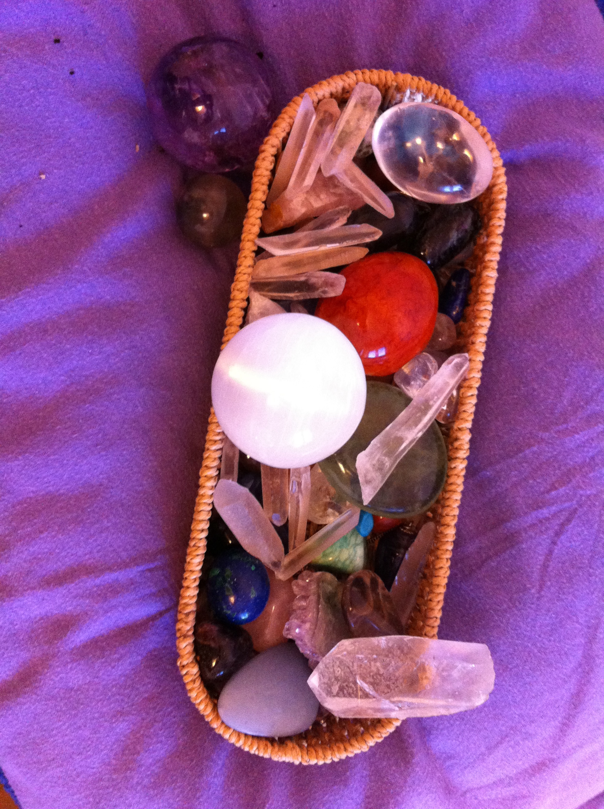 Angela places crystals on different parts of the body and uses crystals to guide them into where and which crystal is needed, the healing is to remove blockages in the aura or the body’s electromagnetic field.